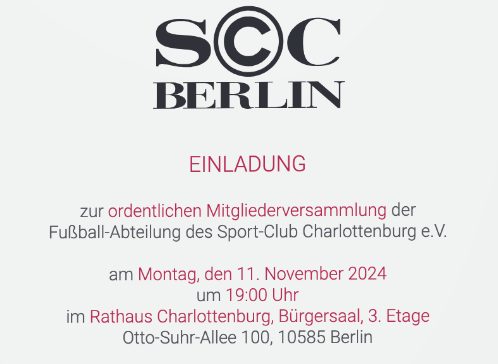 Die nächste ordentliche Mitgliederversammlung der Fußball-Abteilung des Sport-Club Charlottenburg e.V. steht an. Alle Mitglieder der Fußball-Abteilung sind eingeladen, sich am 11.11.2024 um 19:00 Uhr im Rathaus Charlottenburg an der Mitgliederverasmmlung zu beteiligen.